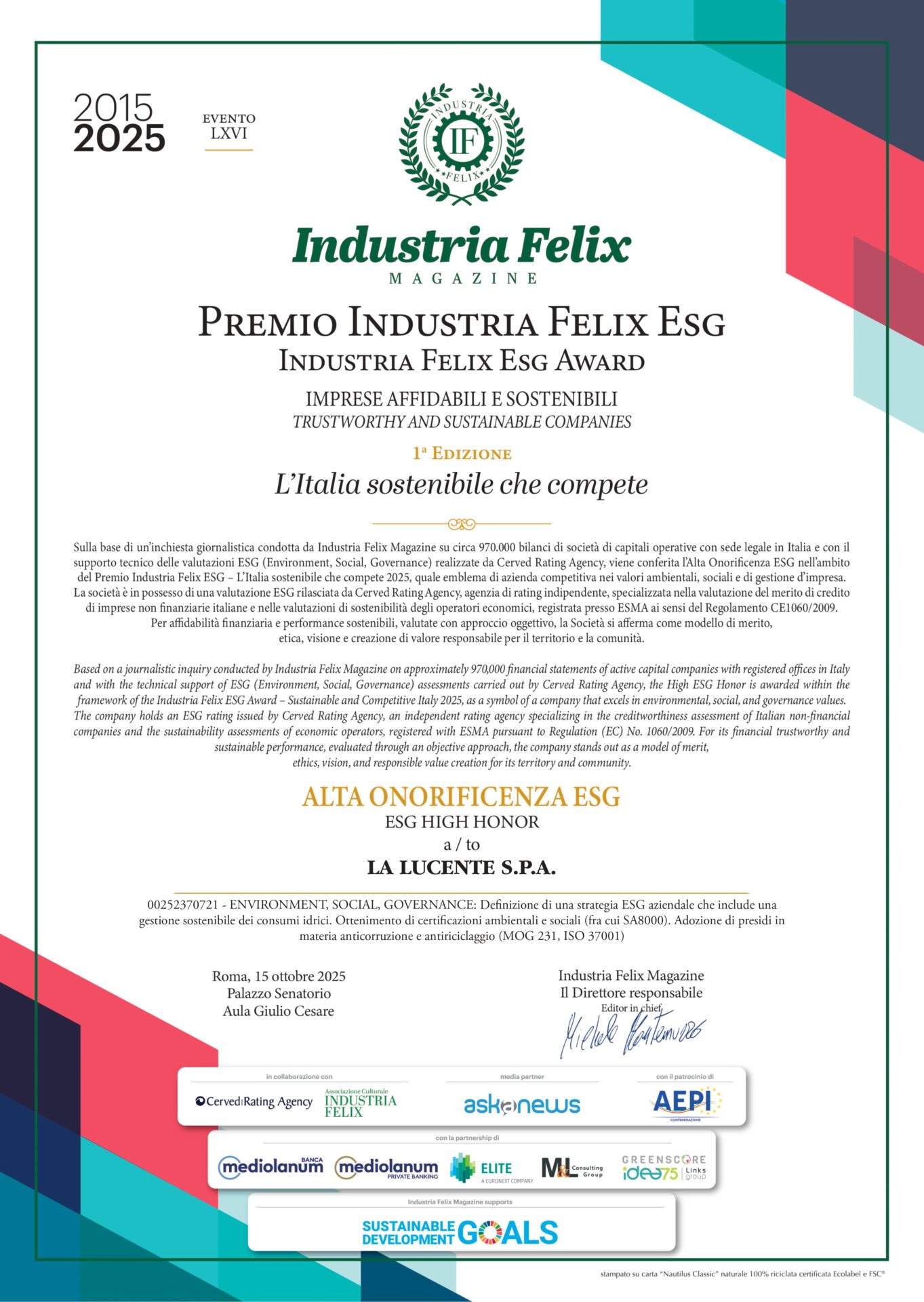 La Lucente SpA è risultata tra le imprese vincitrici della 1ª edizione nazionale del Premio Industria Felix ESG – L’Italia sostenibile che compete, il 66° evento Industria Felix, riservato alle aziende italiane con una spiccata sensibilità per i temi della sostenibilità e più sicure finanziariamente rispetto al Cerved Group Score.