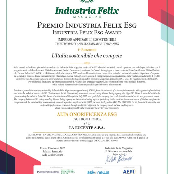 “Ricevere il Sigillo Verde di Industria Felix e l’elevato rating ESG di Cerved rappresenta per noi un riconoscimento importante del percorso che stiamo portando avanti con impegno e responsabilità. Questo risultato non è solo una certificazione del nostro operato, ma anche una conferma della solidità di un modello d’impresa che mette al centro la sostenibilità, l’innovazione e le persone.” – Ha detto il CEO de La Lucente SpA, Angelo Volpe. – “Crediamo che lo sviluppo sostenibile non sia più un’opzione, ma una necessità strategica per garantire valore nel lungo periodo, contribuendo al benessere della collettività e alla tutela del territorio in cui operiamo. Continueremo a investire in soluzioni e pratiche che rafforzino la nostra capacità di generare impatti positivi, promuovendo una crescita etica, inclusiva e rispettosa dell’ambiente.”