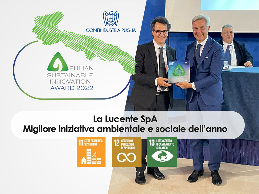 La Lucente SpA si è aggiudicata l’Apulian Sustainable Innovation Award 2022 per la “Migliore iniziativa ambientale e sociale dell’anno” con il Progetto di Educazione Ambientale per bambini “Laboratori di riciclo creativo – Villaggio di Babbo Natale, Bari 2021.